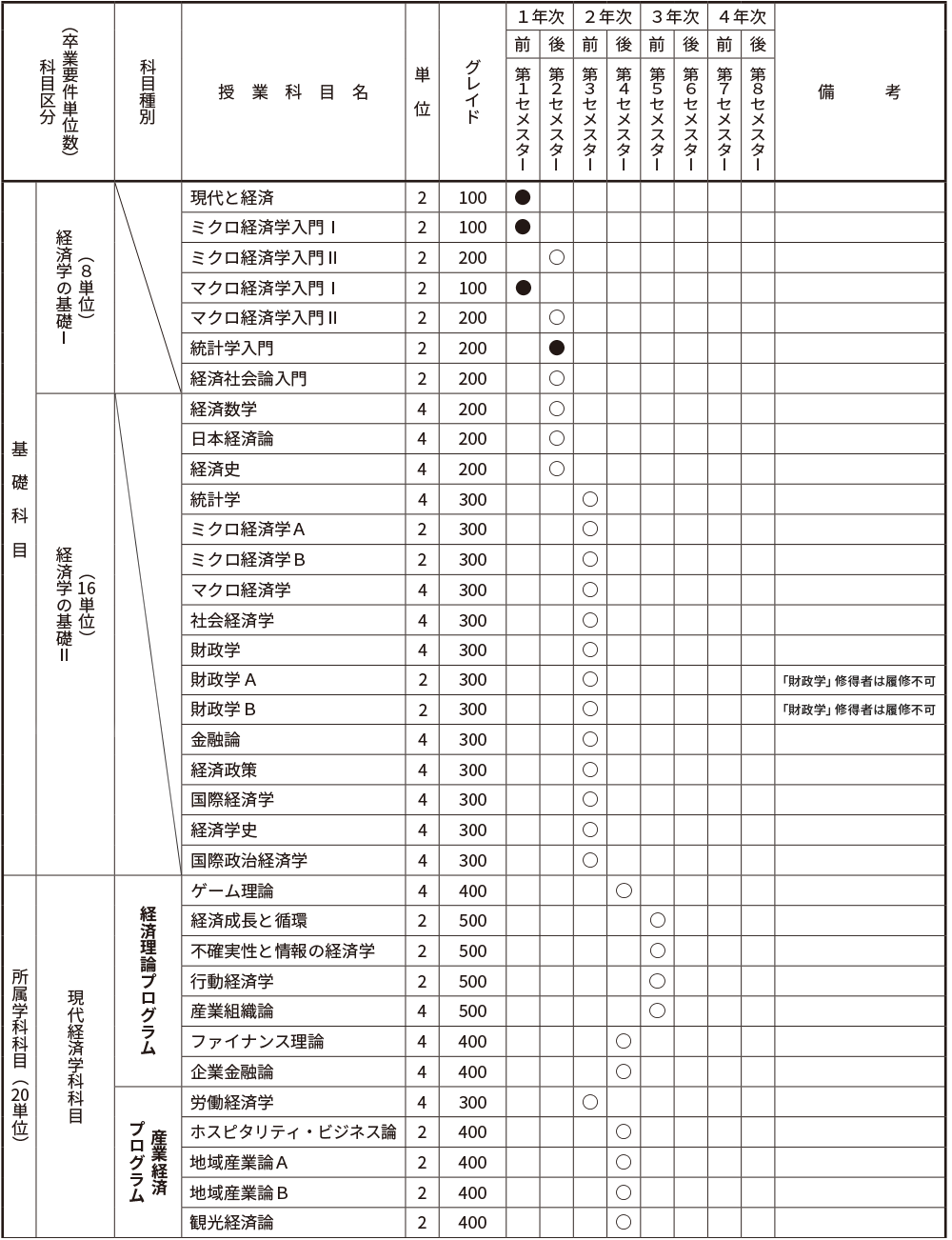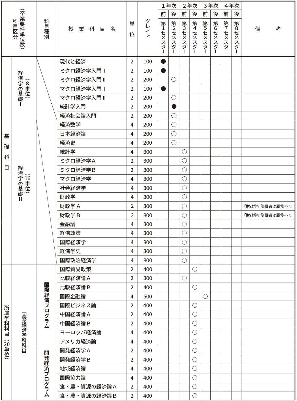 | 経済理論 | 「ミクロ経済学A」「ミクロ経済学B」「マクロ経済学」を履修すること。当該プログラムの科目を16単位以上修得すること。 |