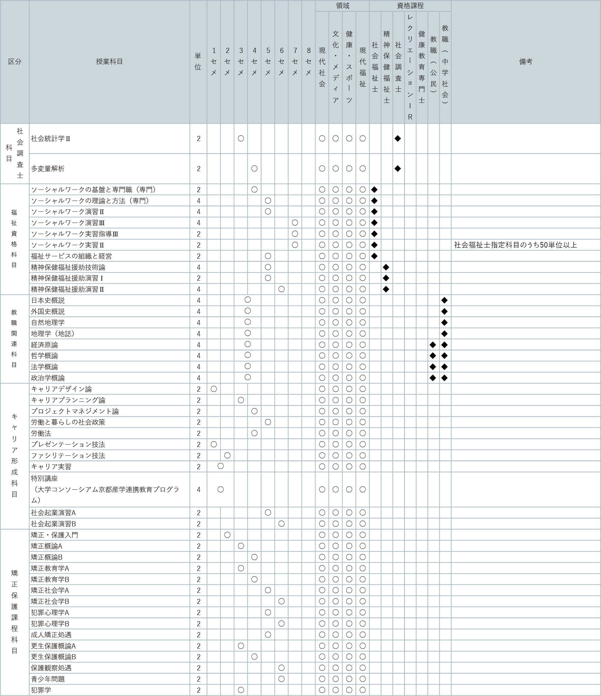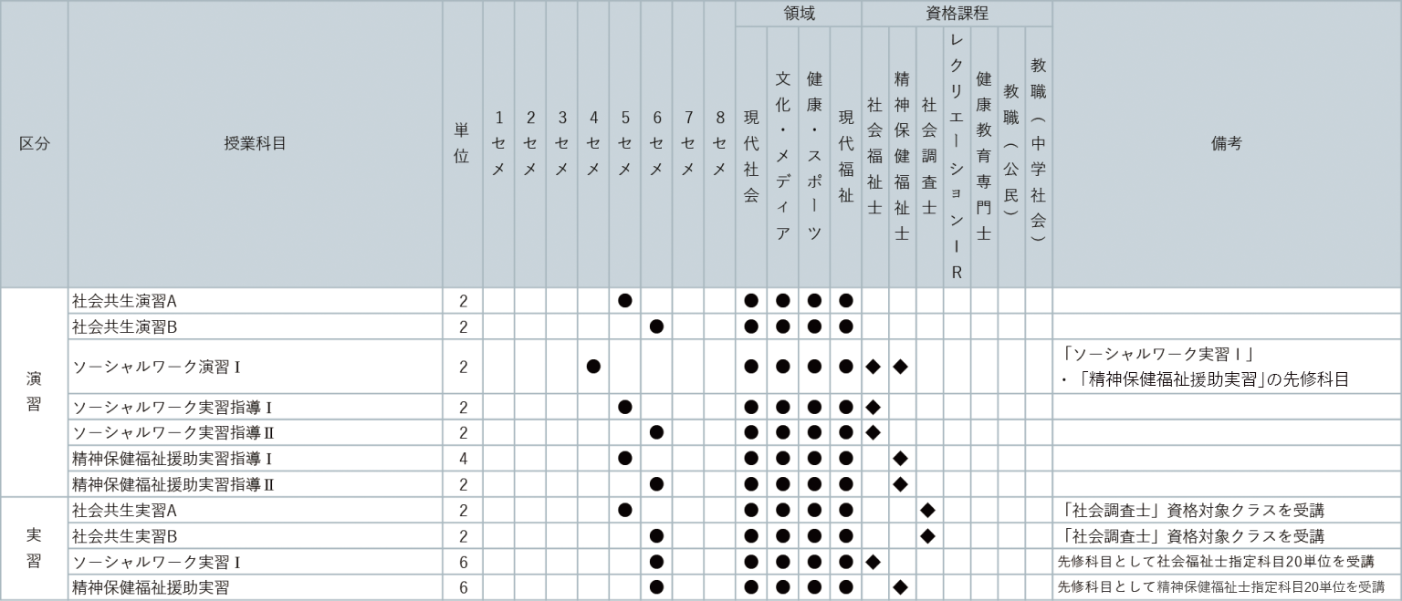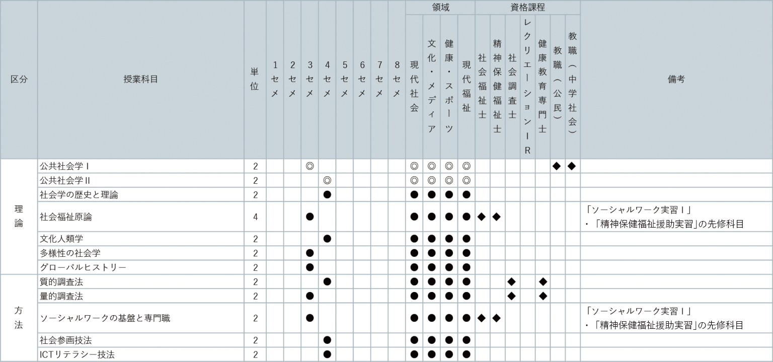 | 専攻科目 | 必修 | 基礎教育科目A群 ・基礎ゼミナールA、B ・社会学への招待 ・社会学概論 ・社会福祉学への招待 ・社会イノベーション実践論 ・共感とコミュニケーション ・社会調査入門 ・社会統計学Ⅰ ・ICTリテラシー実習A、B |