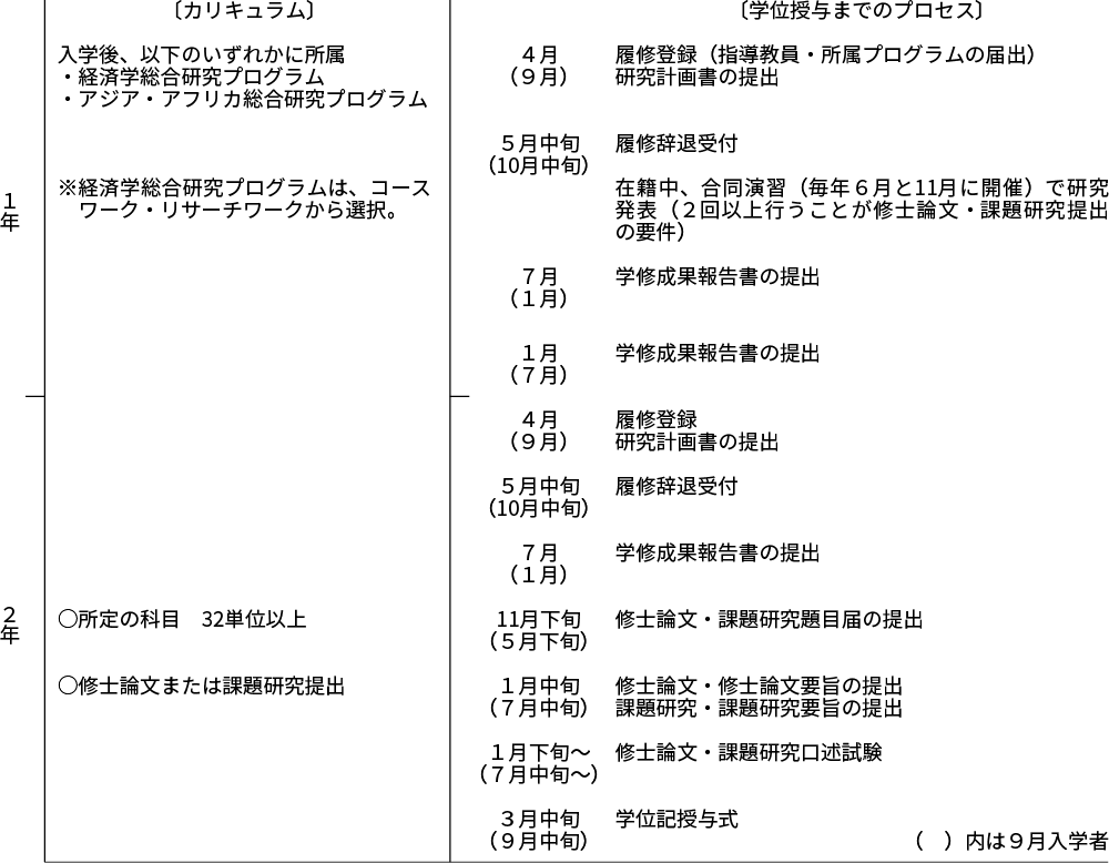 修士課程は、激変する現代社会の諸問題に応えることができる人材の育成を目標とし、特に世界に対する深い理解と創造的な理論構築あるいは応用分析の能力を備えた研究者、高邁な理想と経済学的知識に裏打ちされた高い実践能力を持つ専門職業人等の人材を育成する。